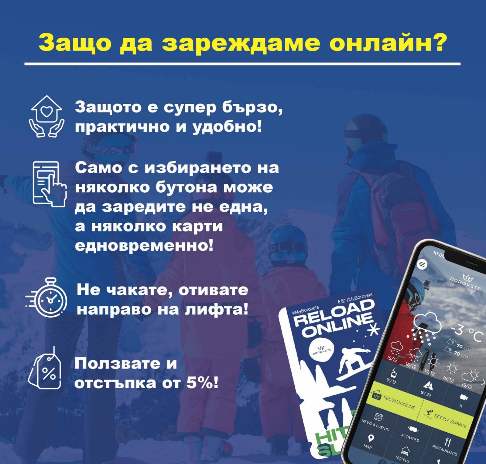4.1. Мобилното приложение "My Borovets" предоставя достъп до интегрираната с него он-лайн платформа предназначена за онлайн презареждане на лифт карти. Приложението е разработено за всяка една от 2-те най-популярни мобилни операционни системи – iOS (Apple) и Android (Google). Целта на мобилното приложение е да предоставя информация за метеорологичната обстановка и условията за практикуване на зимни спортове в курорта, развлекателни активности, новини, събития и полезни контакти в к.к. Боровец, да предоставя онлайн платформа за презареждане на безконтактни лифт карти и резервиране на ски услуги – наем на екипировка и ски/сноуборд уроци.