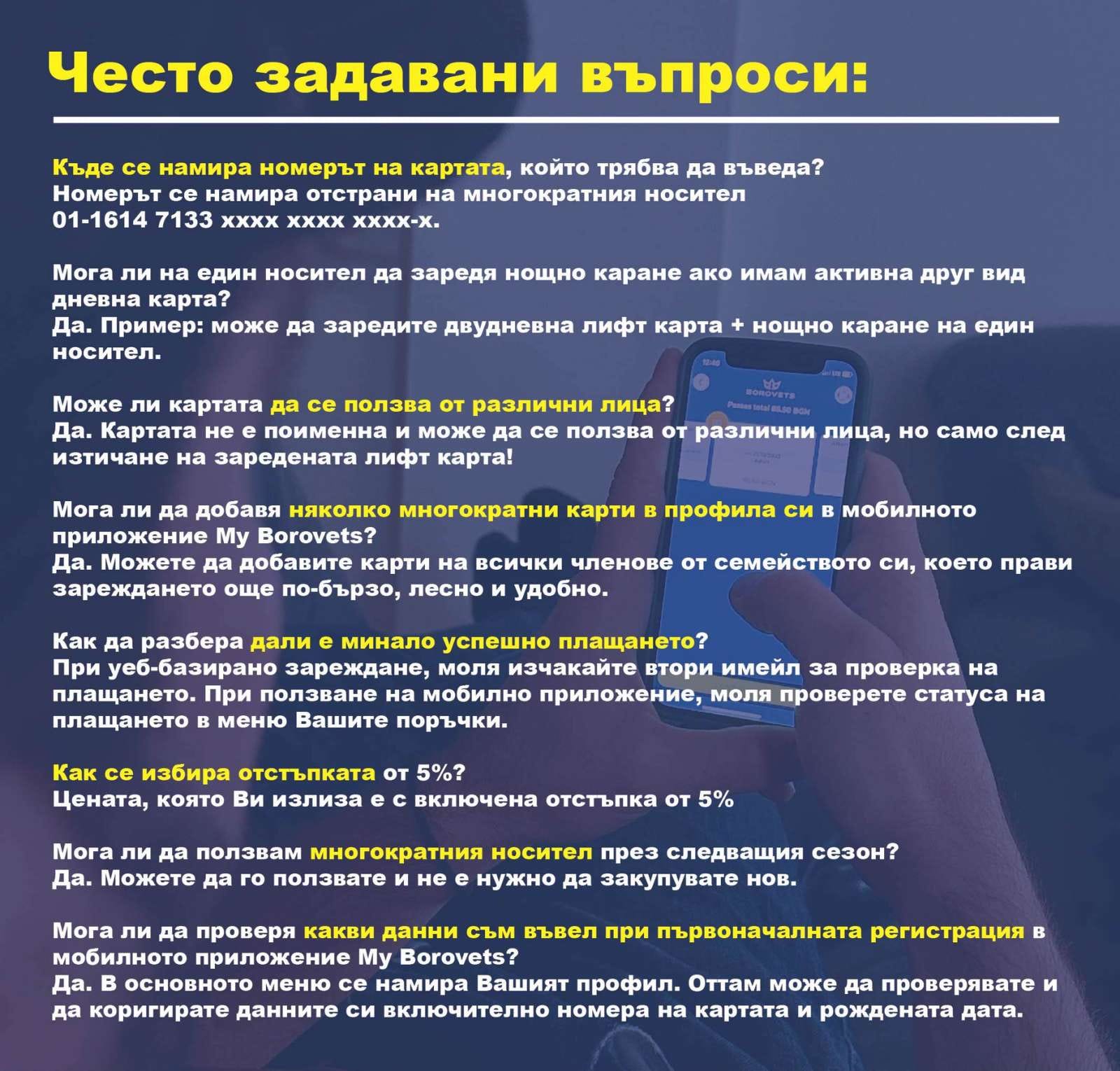 2.Носителите за многократно ползване могат да бъдат презареждани по интернет чрез сайта www.skipoint.info или през мобилното приложение MY BOROVETS със следните услуги: Сутрешна, следобедна, 1 ден, 2 дни, 3 дни, 4 дни, 5 дни, 6 дни и нощно каране.