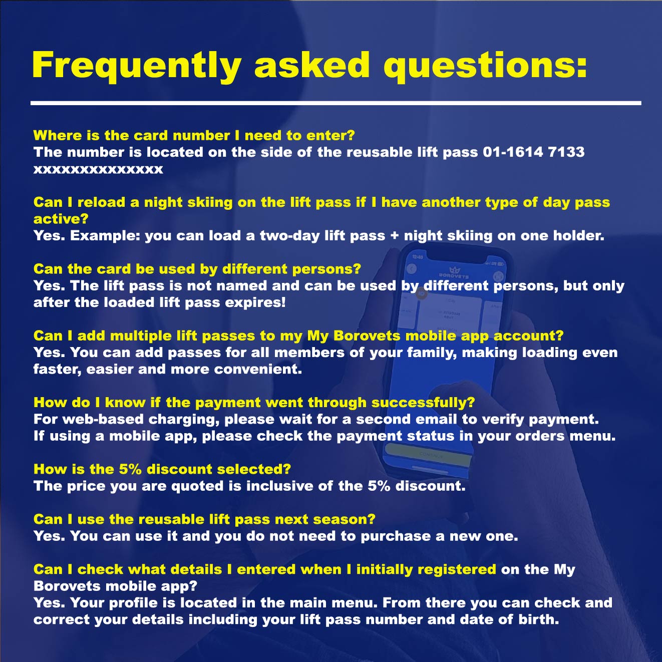 Reload your lift pass online from the mobile app MY BOROVETS Download now from GooglePlay, AppStore or AppGallery